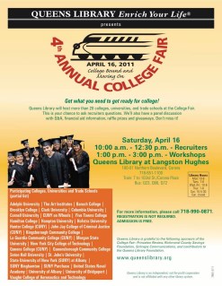 The Queens Public Library (QPL) will host more than 20 colleges, universities and trade schools at its 4th Annual College Fair this Saturday, April 16th from 10 a.m. to 3 p.m. The college fair will take place at the QPL’s Langston Hughes branch, 100-01 Northern Blvd in Corona, Queens.