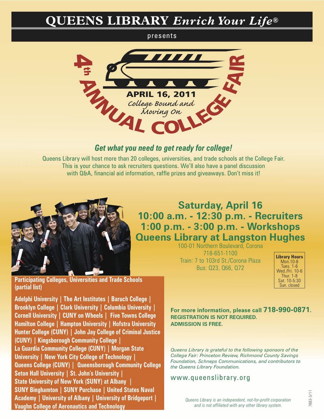 The Queens Public Library (QPL) will host more than 20 colleges, universities and trade schools at its 4th Annual College Fair this Saturday, April 16th from 10 a.m. to 3 p.m. The college fair will take place at the QPL’s Langston Hughes branch, 100-01 Northern Blvd in Corona, Queens.